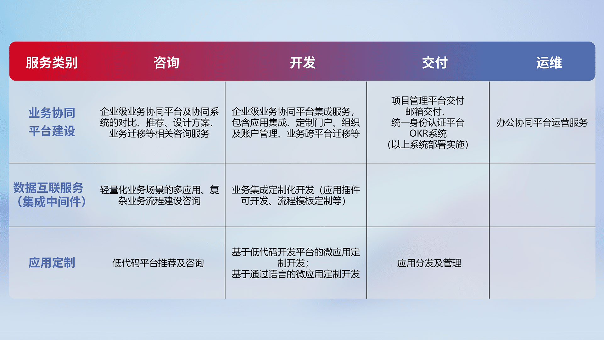 针对钉钉、、、、企微、、、、IDaas等平台级产品提供产品的规划、、、、方案、、、交付、、、、定制化开发等服务,,实现如统一协同办公、、、、智能客户服务、、、、混合会议管理、、、、智能数据查询、、等业务场景,,实现数字化转型。。。。